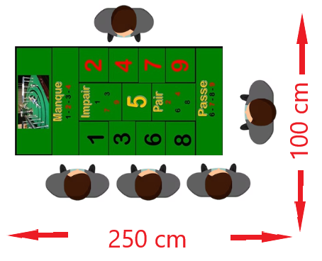 De horse race tafel neemt ongeveer 250 cm (lengte) en 100 cm (breedte) in gebruik qua oppervlakte maar om comfortabel te spelen raden wij aan een ruimte van 400 cm (lengte) en 300 cm (breedte) beschikbaar te hebben. Zodat de gasten en eventuele toeschouwers voldoende ruimte hebben om rond de tafel te kunnen staan.